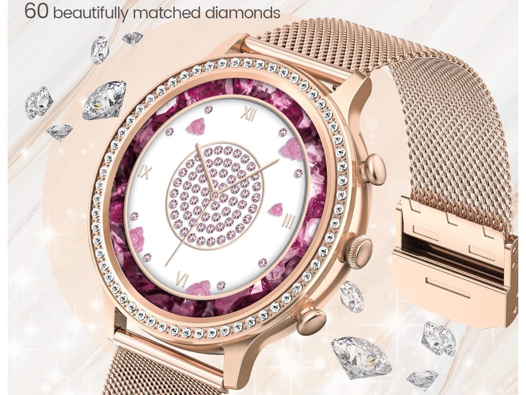 Ceasul inteligent de damă LUMINA Femi I70 Fit întruchipează stilul și eleganța. Designul premium este subliniat de cadranul metalic decorat cu 60 de cristale strălucitoare și echipat cu un ecran AMOLED strălucitor.