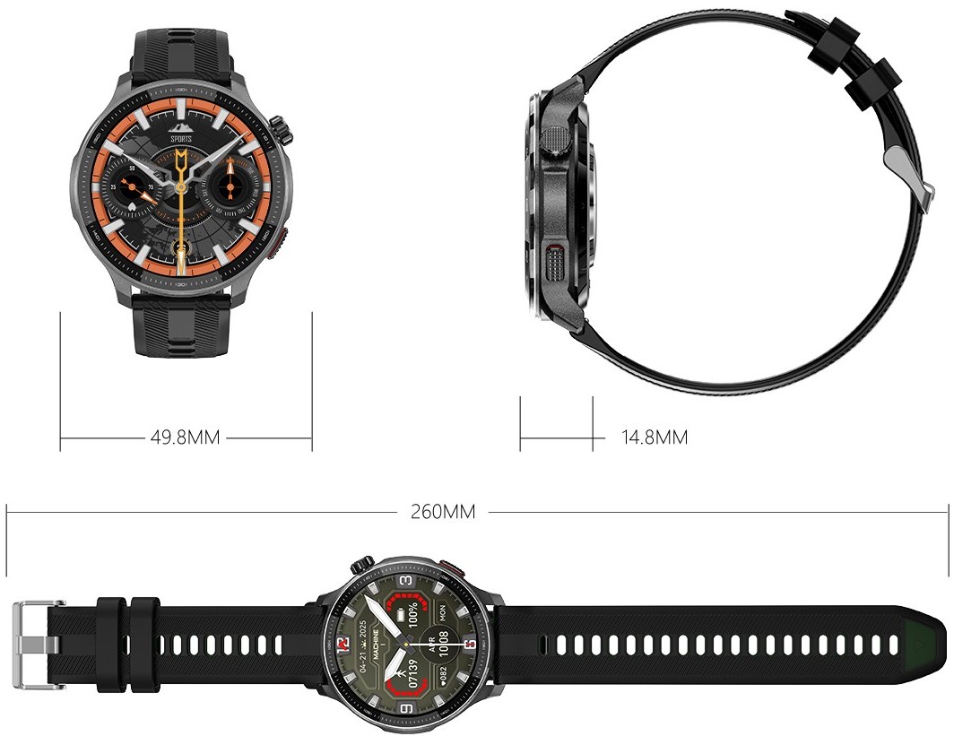 ceas smartwatch EVOLVE G6 Ultra combină un aspect elegant cu funcții pentru sport și activități în aer liber. Echipamentul include GPS dual, hărți offline, navigație, apeluri de pe ceas, 4 GB memorie internă pentru muzică și posibilitatea de a conecta căști wireless. Carcasa ceasului din aliaj de oțel inoxidabil conferă ceasului un aspect premium, asigură duritatea necesară și, în același timp, are o greutate redusă de doar 50g. Ecranul tactil AMOLED este protejat de sticla securizată Corning Gorilla Glass, rezistentă la zgârieturi și zgârieturi adânci. Ceasul este certificat IP69 împotriva prafului, murdăriei și impactului Construcție impermeabilă până la o presiune de 3 ATM pentru înot atât în apă dulce, cât și în apă sărată. Cureaua din oțel oferă ceasului un aspect premium și este confortabilă pentru sport, transpirație și purtare zilnică.