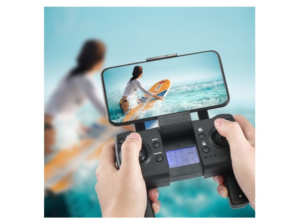Telecomanda are propriul său ecran LED și baterie cu o durată de funcționare de aproximativ 3 ore. După pornire, telecomanda se împerechează automat imediat, iar pe ecranul telecomenzii puteți vedea informații de zbor precum altitudinea, distanța, starea bateriei sau numărul de sateliți GPS recepționați.