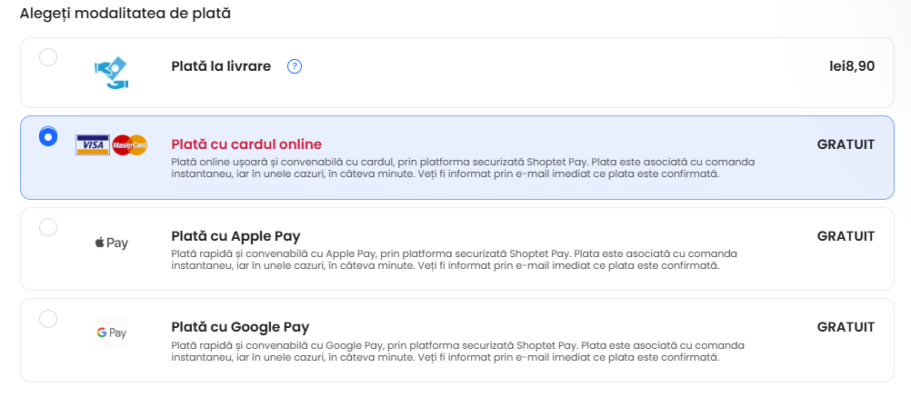 - Plata cu cardul: cea mai rapidă și populară metodă, gratuită.