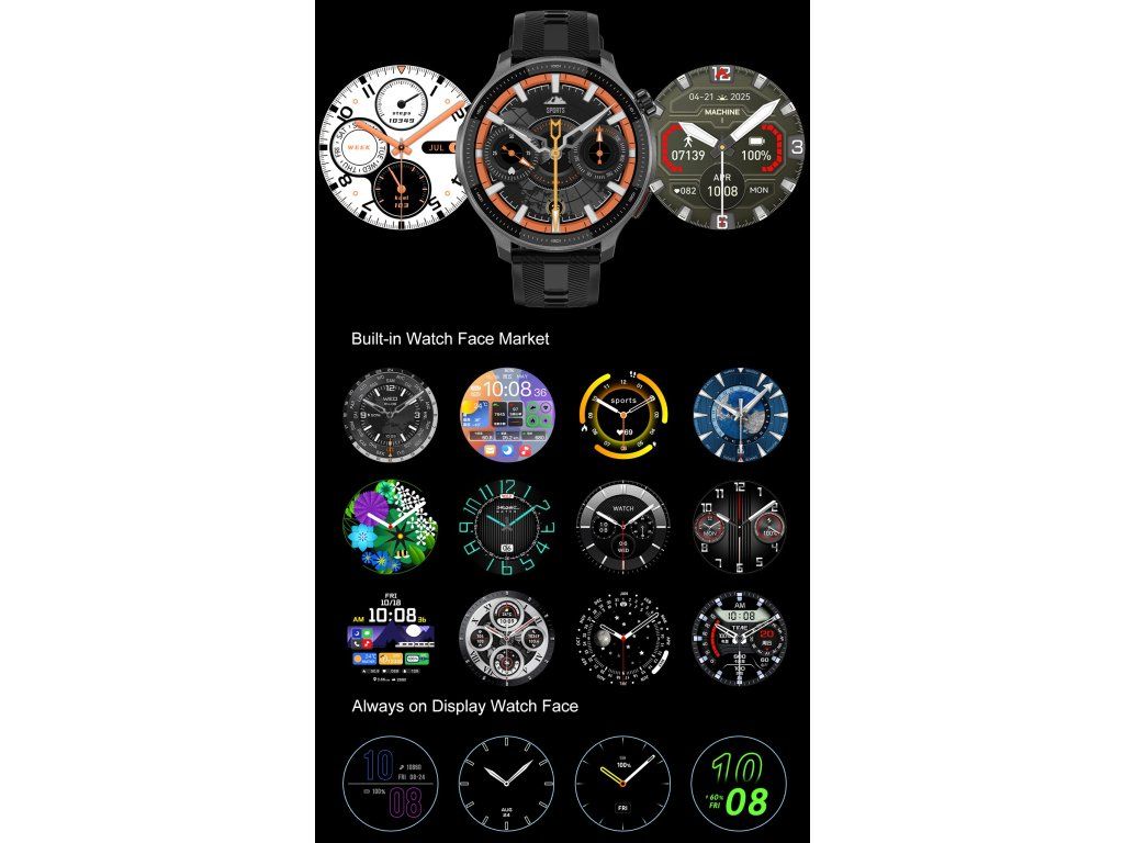 Pentru un control convenabil, personalizează totul pe ceas exact așa cum dorești, inclusiv o curea înlocuibilă, sute de teme și animații clasice pentru fețele de ceas pe ecranul de pornire, posibilitatea de a încărca propria fotografie, de a ajusta stilul de afișare a meniului sau de a seta AOD cu afișare continuă a orei atunci când ecranul este oprit. De asemenea, sunt ușor de utilizat comenzile rapide pentru iluminarea automată a ecranului prin atingere dublă sau rotirea încheieturii mâinii. Puteți opri ecranul punând palma pe el și puteți aprinde lanterna apăsând lung rotița de control laterală. Pentru o securitate sporită, puteți seta un cod PIN pentru a deschide ceasul. Ceasul și aplicația mobilă WearPro sunt complet în cehă și pot fi asociate cu toate telefoanele care au sistemul de operare Android sau IOS.