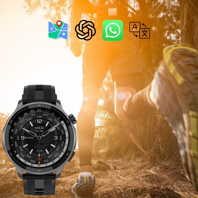 Ceasurile EVOLVE G6 Ultra permit descărcarea de aplicații și jocuri externe. Printre opțiuni se numără Google Maps, care funcționează la fel ca pe telefonul mobil, inclusiv pornirea navigației. Pentru o căutare rapidă de răspunsuri, puteți utiliza Chat GPT, care va căuta și va scrie un răspuns la orice întrebare direct pe încheietura mâinii dumneavoastră. Dacă nu sunteți vorbitor nativ, puteți utiliza Google Translate, care poate traduce text scris și cuvinte rostite în zeci de limbi ale lumii. Pentru comunicare ușoară, există aplicația completă WhatsApp, iar pentru momentele lungi, 8 jocuri care se schimbă constant în aplicație.