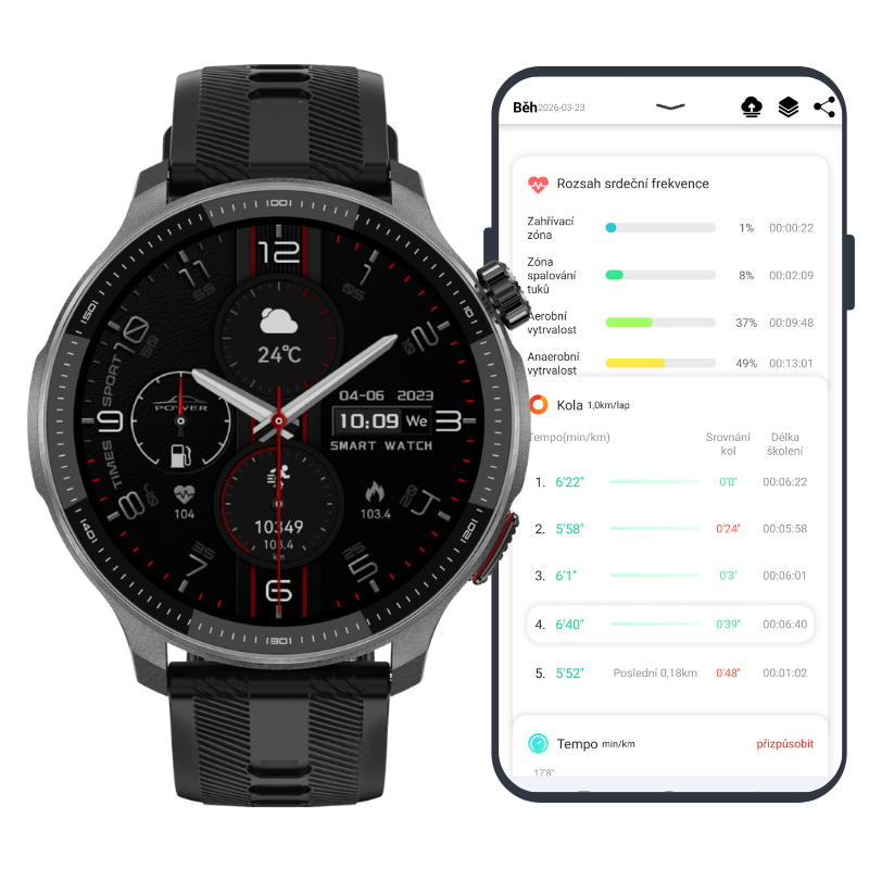 Pentru un control convenabil, personalizează totul pe ceas exact așa cum dorești, inclusiv o curea înlocuibilă, sute de teme și animații clasice pentru fețele de ceas pe ecranul de pornire, posibilitatea de a încărca propria fotografie, de a ajusta stilul de afișare a meniului sau de a seta AOD cu afișare continuă a orei atunci când ecranul este oprit. De asemenea, sunt ușor de utilizat comenzile rapide pentru iluminarea automată a ecranului prin atingere dublă sau rotirea încheieturii mâinii. Puteți opri ecranul punând palma pe el și puteți aprinde lanterna apăsând lung rotița de control laterală. Pentru o securitate sporită, puteți seta un cod PIN pentru a deschide ceasul. Ceasul și aplicația mobilă WearPro sunt complet în cehă și pot fi asociate cu toate telefoanele care au sistemul de operare Android sau IOS.