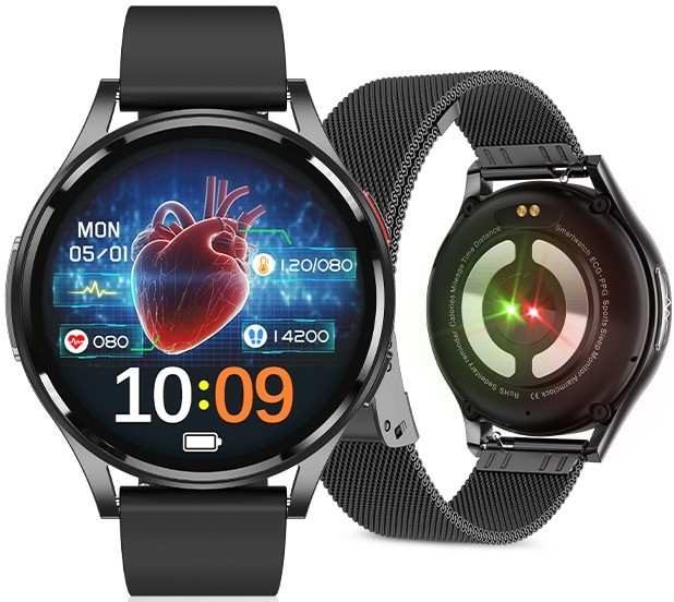 EKG (electrocardiogramă) - măsurarea activității electrice a inimii. Ceasurile inteligente PulsGo HEALTH GE30 utilizează cea mai recentă metodă de măsurare precisă a EKG prin senzori ECG (electrocardiografie) și PPG (fotopletismografie) pentru a crea un grafic detaliat al regularității și frecvenței ritmului cardiac. Pentru o precizie maximă, acestea combină măsurătorile printr-un electrod pe partea laterală a carcasei ceasului cu măsurătorile unui senzor optic pe partea inferioară.