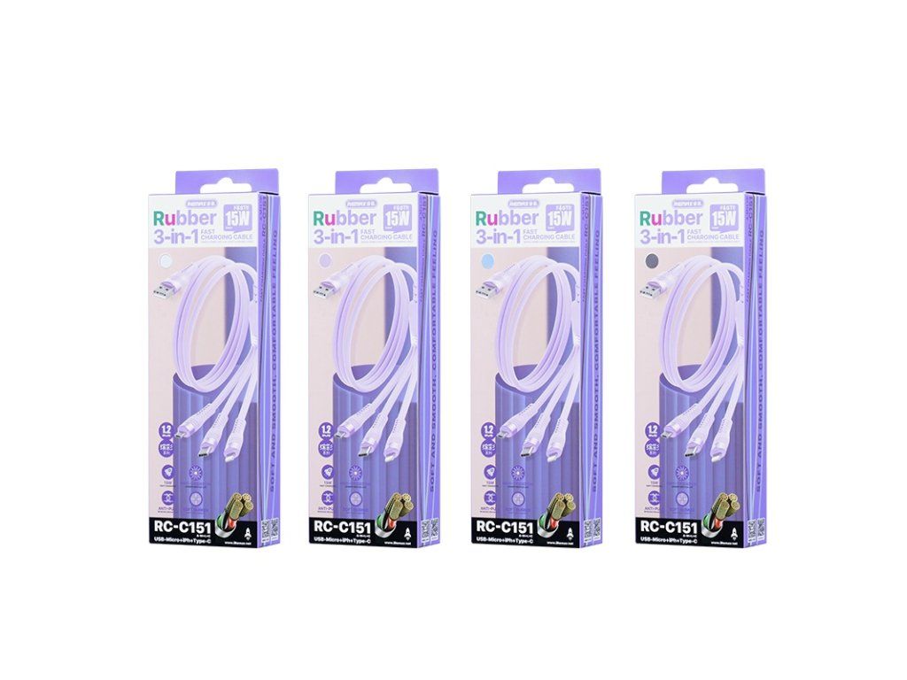 Cablu multifuncțional de încărcare și date REMAX RC-C151 din seria Bintrai Series permite încărcarea a până la trei dispozitive simultan. Cu conectori Micro USB, USB-C și Lightning, puteți încărca convenabil majoritatea telefoanelor, căștilor și altor electronice – acasă, la birou sau în deplasare. Puterea maximă totală de încărcare este 5V / 3A (15W).